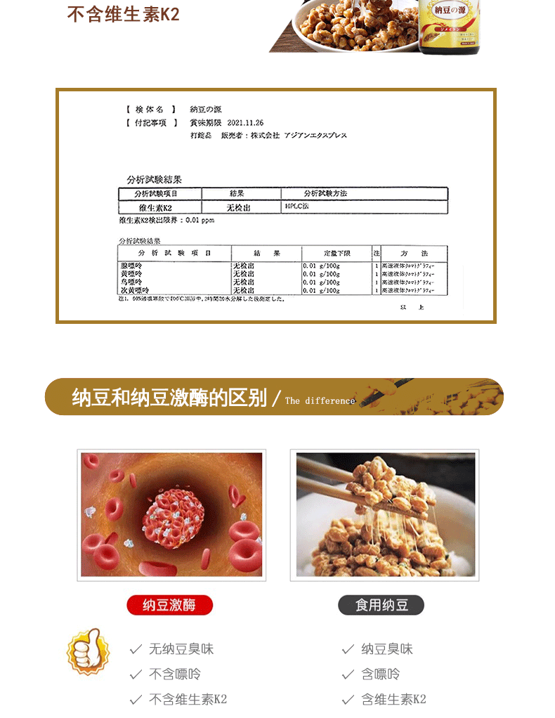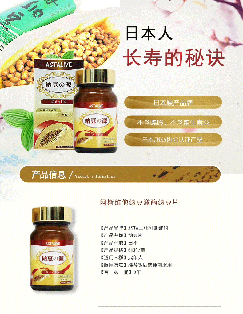 阿斯维他 纳豆压片糖果 更新时间:2018-08-08 点击:7265 所属栏目:一般贸易 Update Time:2018-08-08 Hits:7265 Belong Column:General trade 阿斯维他 洁酶通 纳豆片 售 价:388 产 地:日本 净含量:60粒/盒 产品广告 产品详情 产品特点 产品展示