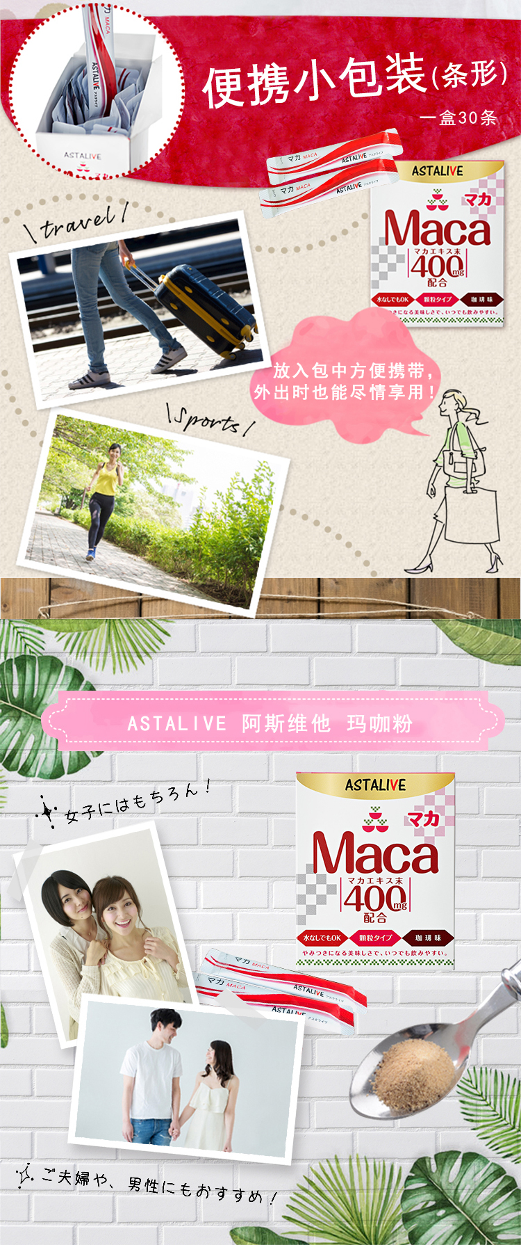 玛咖粉 更新时间:2018-09-03 点击:6318 所属栏目:一般贸易 Update Time:2018-09-03 Hits:6318 Belong Column:General trade 阿斯维他 玛咖粉 售 价:298 产 地:日本 净含量:30条/盒 产品广告 产品详情 产品特点 产品展示